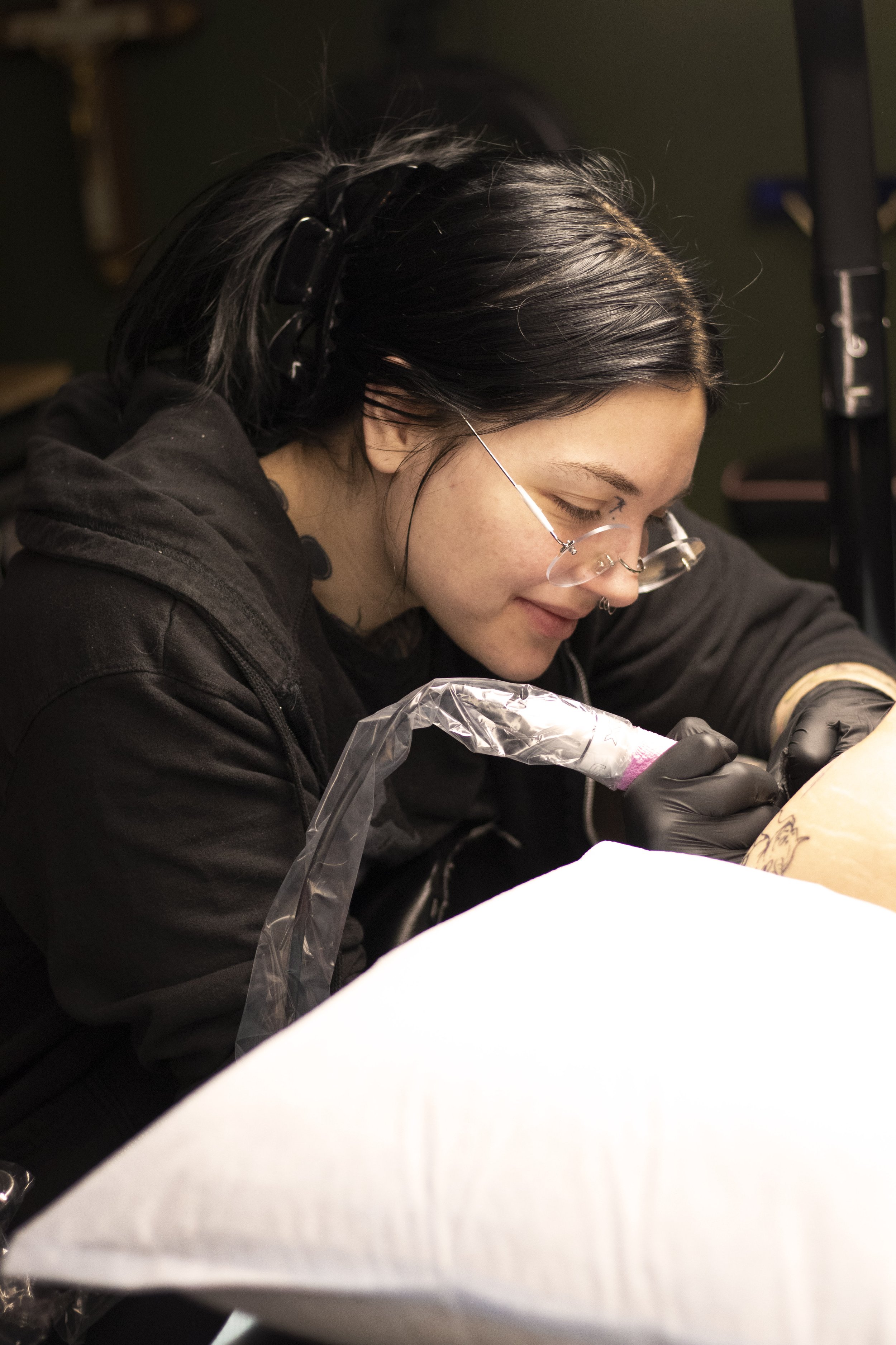 Kailee has been tattooing since 2018, she enjoys creating colorful and fun tattoos. Striving to create a safe and comfortable environment to all. Outside of tattooing she enjoys sewing and can often be found posted up on the couch with a video game and her two kitties.